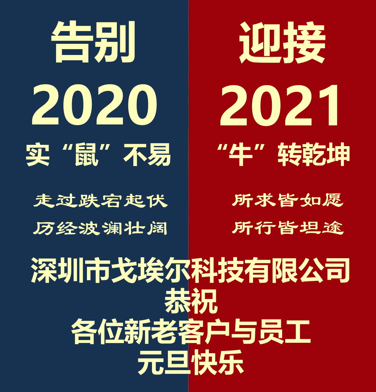 在此,深圳市戈埃爾科技有限公司全體同仁預(yù)祝大家在新的一年里:祝大家身體健康,闔家歡樂(lè),祝您事業(yè)萬(wàn)事順意,牛氣沖天!